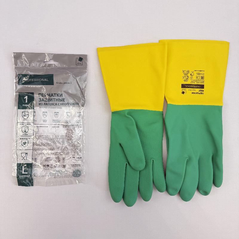 Перчатки латексные с НЕОПРЕНОМ "L" 1пара/115гр зелёный+жёлтый СУПЕРПРОЧНЫЕ